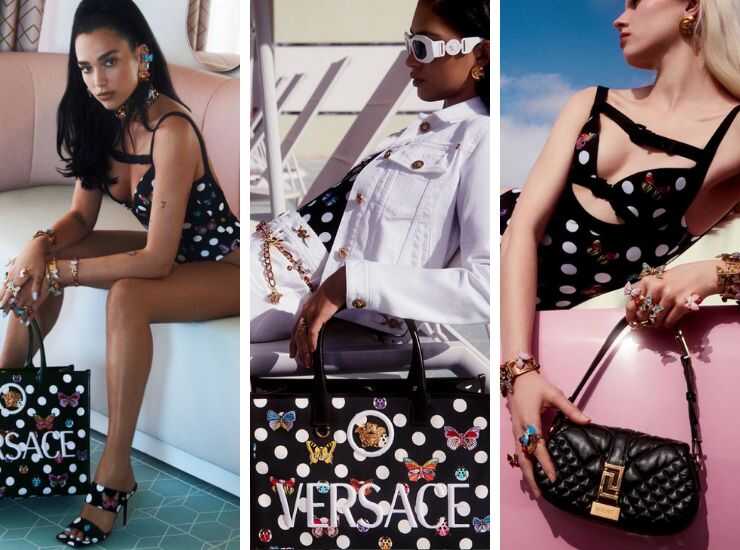 La cantante ha mostrato con occhio ravvicinato ai suoi fan una delle chicche della sua collezione. Il bikini a triangolo, oltre ad essere ravvivato da maxi pois bianchi, propone anche la trama farfalla che aggiunge un guizzo di colore sbarazzino. La trama a pois pensata per il beachwear Versace riguarda anche il costume intero con dettagli cut out, così come la Butterflies Tote Bag, così colorata e perfetta per dettare tendenza in spiaggia così come ad un cocktail party. Anche le calzature ad esempio non rinunciano al dettaglio pois, come dimostrato da Dua Lipa che figura anche tra le protagoniste della campagna per La Vacanza.