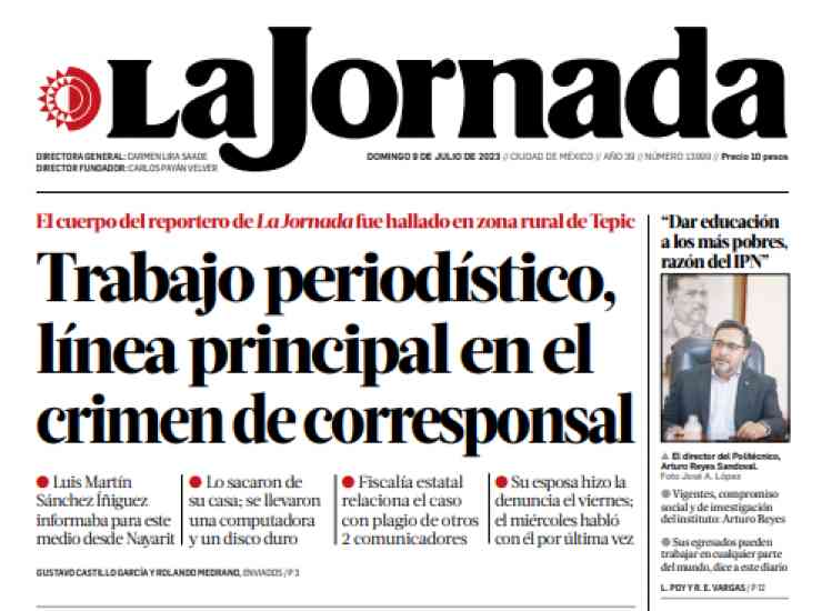 “Un corpo trovato nella località di Huachines, nel comune di Tepic, è risultato essere quello di Luis Martín Sánchez Iñiguez, 59 anni, corrispondente del quotidiano La Jornada scomparso da mercoledì.” Così si legge sul sito internet del quotidiano che nel dare la notizia cita le “autorità locali.” La sparizione del giornalista – spiega La Jornada – era emersa venerdì 7 luglio, grazie alla segnalazione della moglie Cecilia López presso la Procura generale dello Stato.