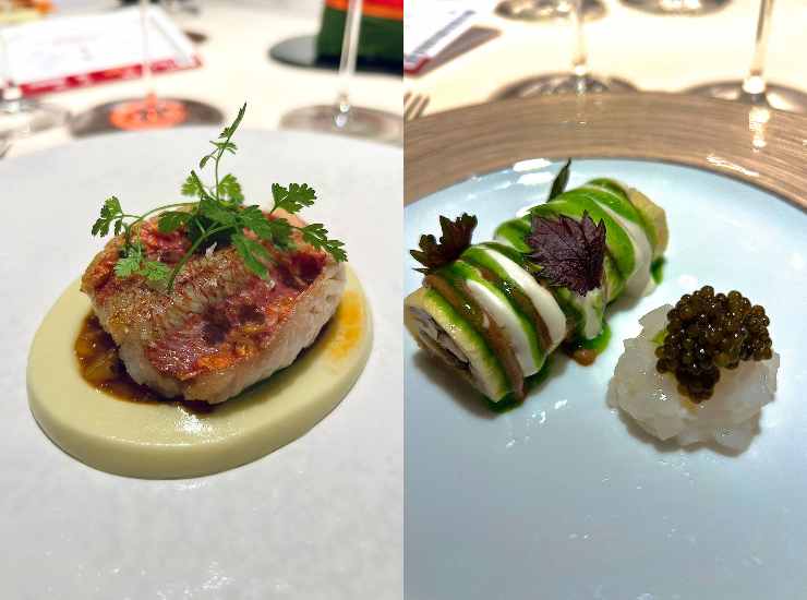 “Dalla pista dell’Enoteca fiorentina raggiungiamo Capa di cocco per poi immergerci nel fitto sottobosco tra funghi, asparagi e calamari! Sorvoleremo le acque del Mediterraneo scorgendo fantastici banchi di triglie mentre stormi di faraone ci accompagneranno dolcemente all’atterraggio tra profumatissimi campi di ciliegi.” Così gli Chef danno il benvenuto ai “passeggeri”, mentre Chef Borghese li accoglie con capasanta affumicata, insalata di cuore di bue, basilico e crema cocco e coriandolo, quinoa bianca croccante, intanto un meraviglioso Chablis Premier Cru Montée de Tonnerre 2020 – Gerard Duplessis accompagna la salita iniziale.