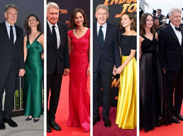 Alla première del quinto capitolo di Indiana Jones a Berlino, l’attrice ha accompagnato Harrison Ford sul tappeto rosso, proponendo un vibrante long dress rosa ciliegia, con scollo a V. Si tratta di un abito d’archivio di Zac Posen. Stesso film, ma differente anteprima. Questa volta ci spostiamo a Los Angeles. Per l’occasione, mentre il marito ha indossato un look blu navy con camicia a righe, la moglie ha aggiunto un tocco di colore con una gonna giallo sole in raso, abbinata ad una blusa nera in raso con scollo dritto. A curare i suoi look è Elizabeth Stewart, stylist ben nota al panorama hollywoodiano. L’abito proposto da Calista Flockhart è un riciclo del suo guardaroba che risale agli Emmy 1999 e si tratta di una creazione di Ralph Lauren. Indiana Jones è stato presentato in anteprima al Festival di Cannes, motivo per cui il protagonista non poteva mancare. Alla Croisette, Ford ha scelto un classico smoking. Sua moglie, invece, ha proposto un abito nero plissé in chiffon di Zuhair Murad, a cui ha abbinato gioielli Chopard.