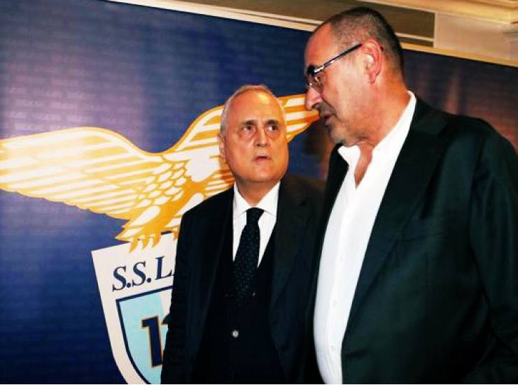 Il presidente della Lazio, Claudio Lotito, (a sin.) con l’allenatore Maurizio Sarri. Foto Twitter @VSanSebastiano
