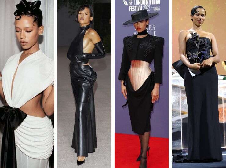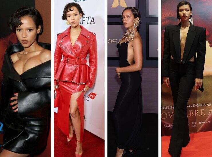 Così come è ancora Schiaparelli Haute Couture il look proposto ai Governors Awards 2022. Per l’occasione ha scelto un midi aderente nero della collezione Fall 2022, a cui ha abbinato gioielli scultura della maison. Sul red carpet dei BAFTA Tea Party 2023, ha optato per un abito total red di Alexander McQueen, con top effetto giacca in pelle e gonna con dettaglio cut out. Vi ha abbinato pochette e sandali con tacco a spillo, un look interamente firmato McQueen. Ed è ancora dello stesso marchio l’abito cut out total black con blazer e spalline a punta scelto per la première di Bones and All a Roma. Per lo stesso film, ha partecipato all’AFI Fest indossando una creazione black&white con dettagli cut out e drappeggi delicati di Loewe.