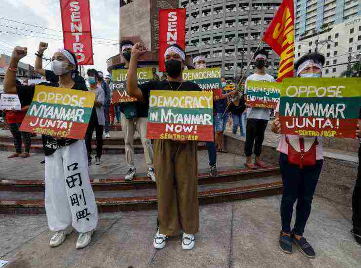 Manifestanti nelle Filippine denunciano nel 2022 l’esecuzione dei leader pro-democrazia in Birmania. Foto Ansa/Epa Rolex Dela Pena