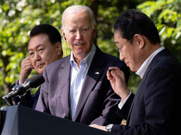 “Voglio riconoscere l’importante lavoro che entrambi avete svolto e il coraggio politico che entrambi avete dimostrato” ha detto Biden ai suoi ospiti. “Oggi sarà ricordato come un giorno storico“. Il presidente americano ha sottolineato inoltre “lo stretto rapporto tra Giappone e Corea, e con gli Stati Uniti“. Quindi ha aggiunto: “Il mondo si trova a un punto di svolta“.