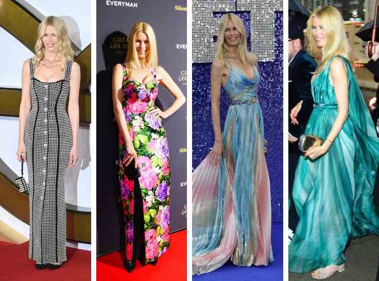 Pur essendo particolarmente legata al panorama glam, Claudia Schiffer manca da tempo sul tappeto rosso. Una delle sue ultime apparizioni pubbliche risale al 2021. In occasione della première mondiale di The King’s Man, la modella ha sfoggiato un abito total black rivestito di perle, con maxi bottoni che accompagnano la silhouette in una linea centrale. Si tratta di un abito costum di Balmain, a cui ha abbinato ballerine in velluto e micro pochette in pendant. Quell’anno è apparsa anche alla première londinese di Silent Night. Per l’occasione, la modella ha optato per una creazione floreale. Il suo long dress tempestato di fiori colorati con spalline doppie e scollo a cuore porta la firma di Richard Quinn.