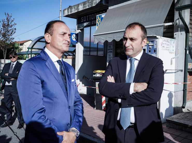 Il presidente della Regione Piemonte Alberto Cirio (a sin.) e il sindaco di Torino Stefano Lo Russo alla stazione di Brandizzo. Foto Ansa/Tino Romano