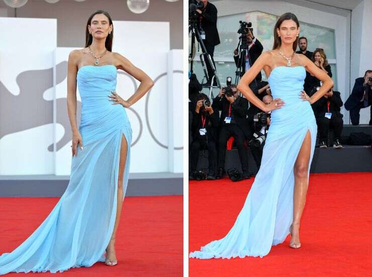 Il long trench in denim stone washed è ricamato a mano. Il corpetto rigido, a punta e con scollo a cuore e dettaglio cut out richiama i pantaloni a vita alta. Prima ancora di Bianca Balti, le star hanno rilanciato il trend dei cargo per il 2023. Non stupisce che sia una modella attenta alla moda come Bianca Balti a richiamarli in causa. Il completo fa parte della collezione Resort 2024 di Ermanno Scervino. Anche poco dopo, per il suo primo red carpet di questa edizione, la modella ha scelto una creazione del marchio, ma questa volta niente denim. Fasciata in un abito azzurro senza spalline in seta, l’abito costum made propone uno spacco ad altezza coscia e dettagli leggermente drappeggiati.