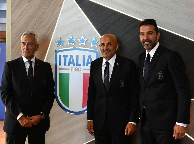 Il ct della Nazionale Luciano Spalletti (al centro), il presidente della Figc, Gabriele Gravina, e Gianluigi Buffon. Foto Ansa/Claudio Giovannini