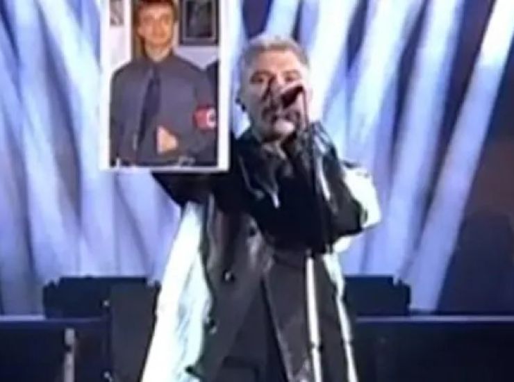 Fedez a Sanremo 2023 con la foto del viceministro Bignami vestito da nazista. Foto Twitter @espressonline