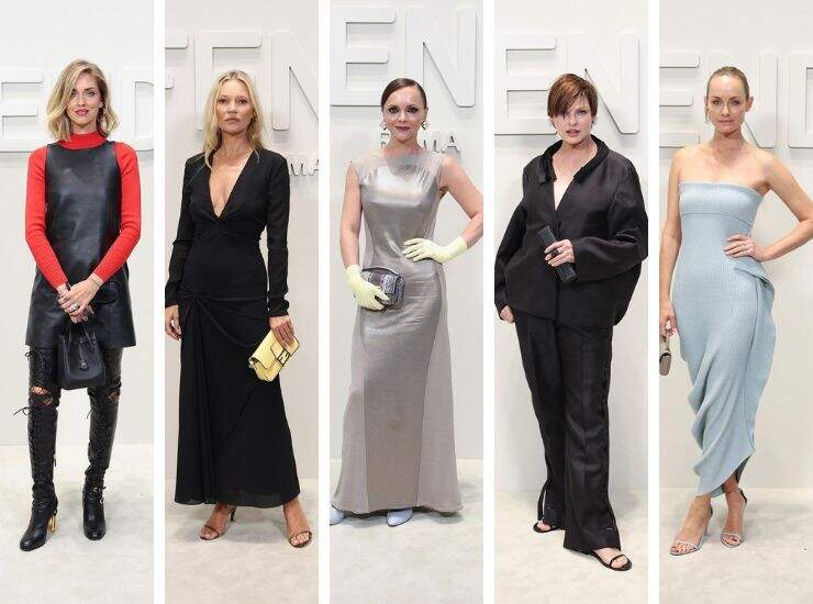 Anche Kate Moss ha raggiunto Milano per la settimana della moda per Fendi, indossando un long dress total black con scollatura a V. Vi ha abbinato una pochette color crema della maison. Christina Ricci invece ha scelto un abito in avorio, abbinato a guanti color crema e décolleté cerulee. Total black è in tailleur oversize optato da Linda Evangelista. Amber Valletta, invece, ha preferito un midi aderente a costine di una delicata sfumatura d’azzurro senza spalline.