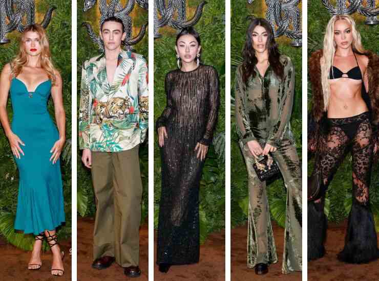 Per Jessica Wang l’abito gioca ugualmente con le trasparenze, avvolgendo la silhouette in una cascata di strass total black. Michele Bravi sfoggia un look animalier, con blazer jungle coloratissimo. Ed è sempre a tema jungle il completo in velluto proposto da Giulia Salemi. Seguendo il trend turchese, Chloe Lecareux ha sfoggiato un midi in raso aderente con scollatura geometrica.