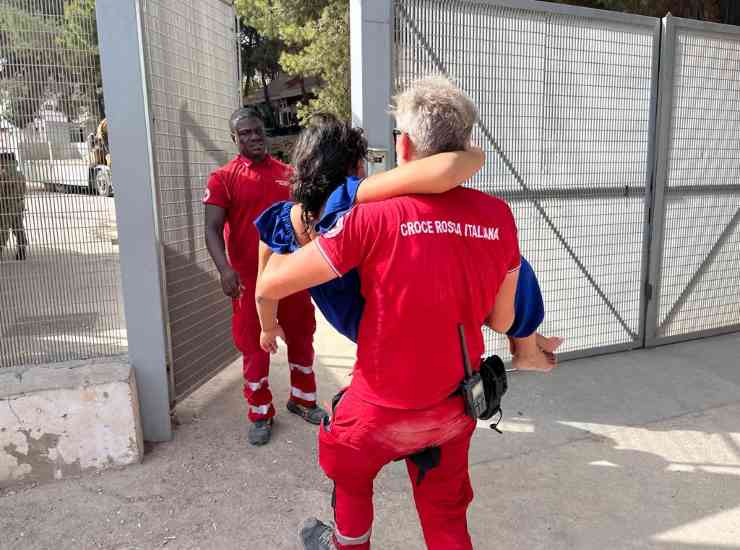 Un operatore della Croce Rossa aiuta una migrante a Lampedusa. Foto Ansa/Croce Rossa