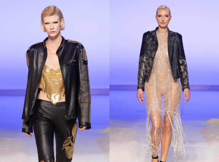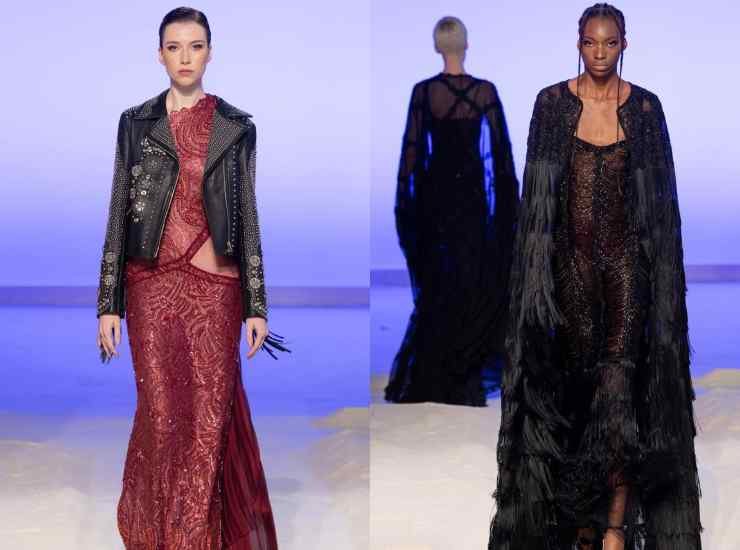 Per leggere la sua couture, è importante capire che Anton Giulio Grande non si è mai fermato in superficie, non si è mai accontentato, cercando di raggiungere il massimo dell’opulenza in ogni suo dettaglio. I suoi sono capi unici amati dalle star di tutto il mondo, che li indossano riuscendo a farli vivere. Il lavoro del designer molto spesso è stato etichettato come spettacolare. Per questa collezione Grande rivisita gli archivi, un patrimonio infinito che gli ha permesso di plasmare una nuova identità, riuscendo anche questa volta a proporre capi esclusivi in pelle, scardinando le convinzioni della couture “convenzionale”. Ciò che ne esce è una nuova moderna eleganza con giacche di pelle e bomber elaborati con frange, borchie e swarovski da sovrapporre a gonne lunghe e vaporose.