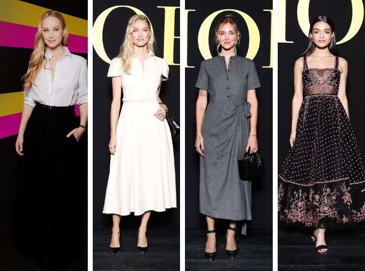 Tante le celebrità arrivate a Parigi soprattutto per sostenere la nuova sfilata di Dior alla Paris Fashion Week. Non è passata inosservata Beatrice Borromeo, con indosso un abito a corolla nude con cinturino ton sur ton della maison. Anche Jennifer Lawrence ha raggiunto la settimana della moda, indossando per Dior un completo black&white.