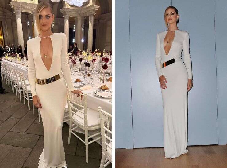 Per quella collezione Tom Ford (che era alla guida del brand da due anni) si era posto un obiettivo, o meglio aveva deciso di lanciarsi un guanto di sfida da solo: proporre in passerella una serie di abiti rigorosamente bianchi, da sera, con linee semplici, ma che fossero al tempo stesso seducenti con l’aggiunta di dettagli preziosi e ammalianti. Ed ecco che uno di quegli abiti, a distanza di anni, è tornato sotto la luce dei riflettori. E a indossarlo è Chiara Ferragni, che ha un rapporto molto stretto con Gucci. L’imprenditrice vi ha abbinato delle décolleté in pelle effetto metallizzato, sempre firmate Gucci. E anche gioielli luminosi di Tiffany&Co come la collana in oro. Anche Bella Hadid aveva indossato un abito della stessa collezione al Festival di Cannes 2022.