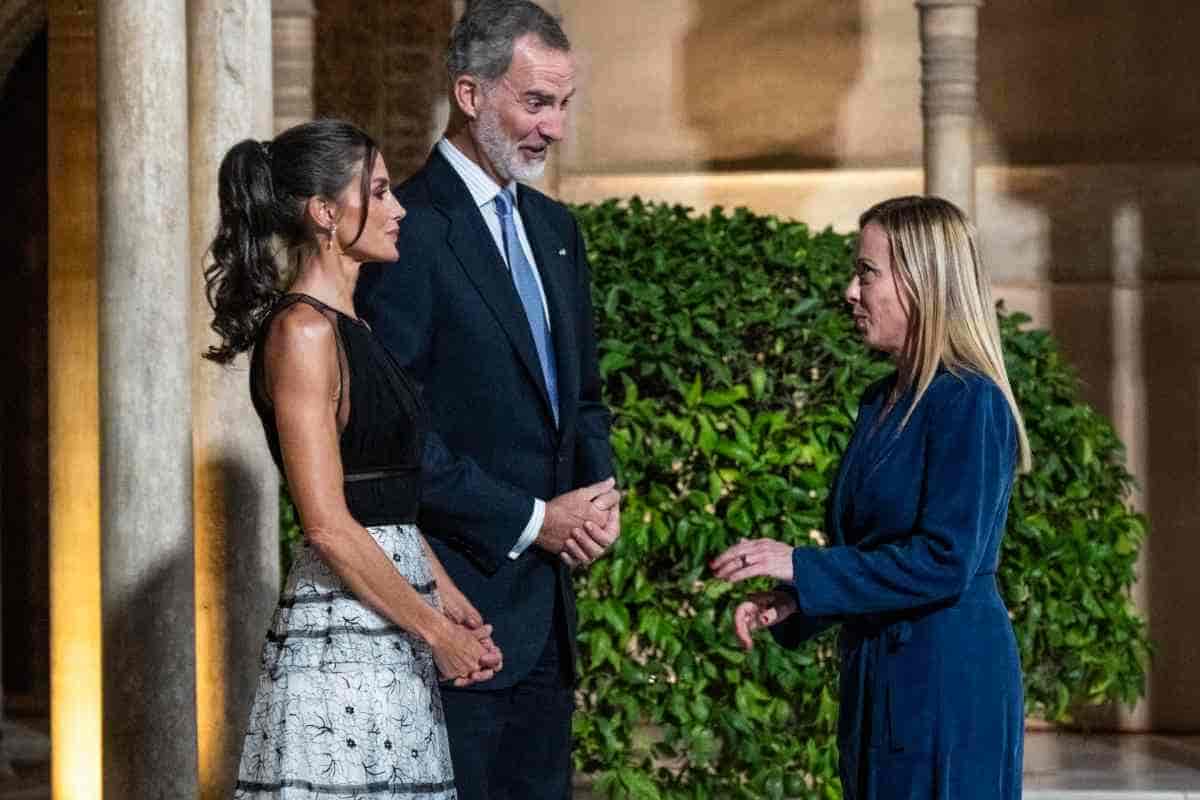 Per riunire tutti i partecipanti al vertice, il re Filippo e la regina Letizia di Spagna hanno deciso di organizzare una sontuosa cena di stato in un edificio storico di Granada. Per l’occasione la Sovrana è apparsa elegantissima, mentre accoglieva i partecipanti accanto al marito sotto i colonnati della Corte dei Leoni. Questo cortile fa parte di uno dei tre palazzi Nasridi situati nella fortificazione dell’Alhambra. Tra gli ospiti dell’evento naturalmente anche Giorgia Meloni ed Emmanuel Macron.
