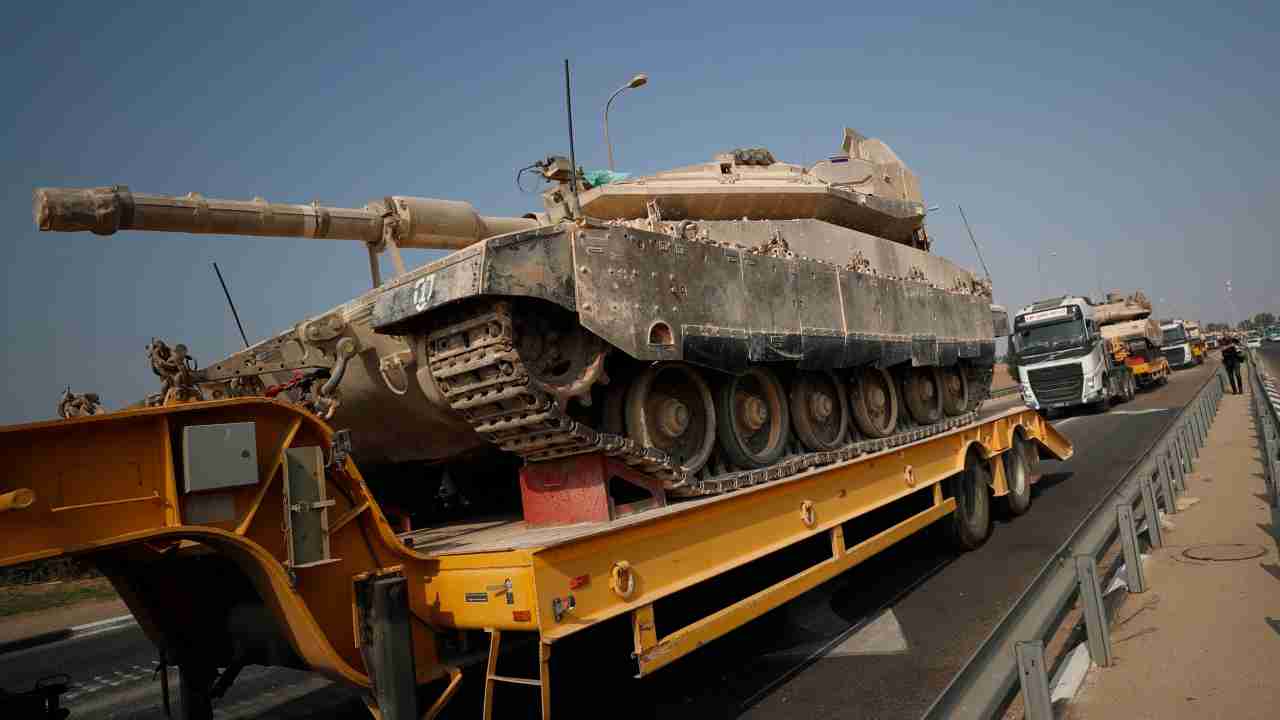 L’esercito israeliano trasporta carri armati verso il confine con Gaza. Foto Ansa/Epa Safadi Atef