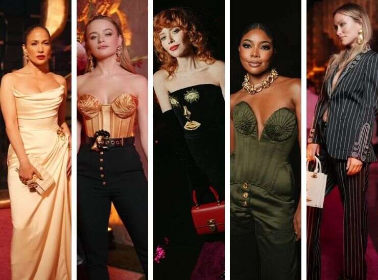 Anche Jennifer Lopez ha puntato al look total golden, indossando un tubino aderente senza spalline in raso di una delicata sfumatura d’oro accompagnato da vistosi orecchini e occhiali da sole in pendant. Il look fa parte della collezione Autunno/Inverno 2023-2024 della maison. Vi ha abbinato décolleté di Christian Louboutin. Verde oliva è il completo jumpsuit proposto da Gabrielle Union, con corpetto plissé e collana scenografica abbinata. Per Olivia Wilde la scelta è ricaduta su un completo gessato, un tailleur con maxi bottone a cui ha abbinato anche le décolleté a punta. In raso è il long dress indossato da Natasha Lyonne. Vi ha abbinato guanti total black e pochette rosso cremisi.