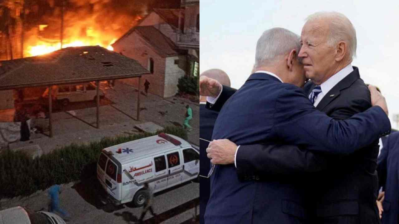 L’esplosione all’ospedale di Gaza (a sin.); Biden abbraccia Netanyahu. Foto Ansa/Epa/VelvetMag