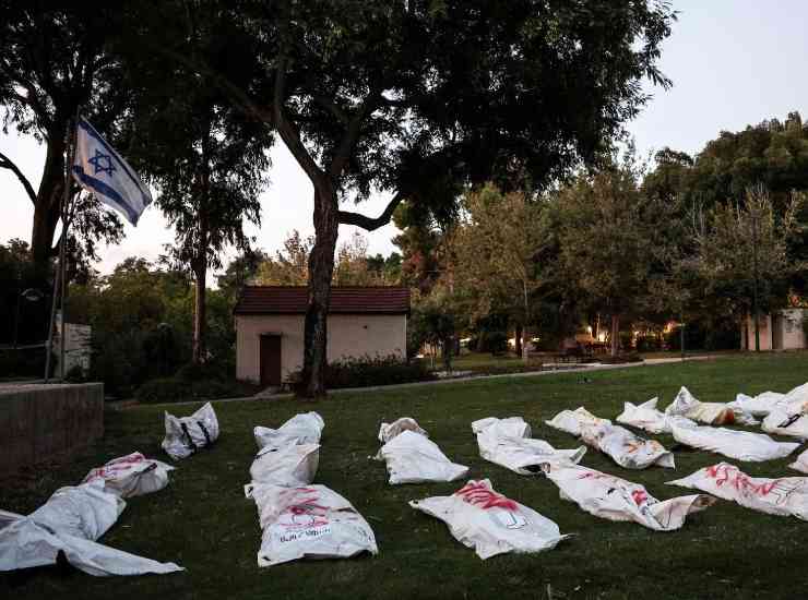 Cadaveri in un kibbutz israeliano dopo il massacro di Hamas del 7 ottobre. Foto Twitter @AntonellaNapoli