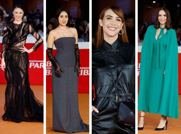 Ludovica Coscione ha optato per un completo jumpsuit total black in pelle, che cade morbido sulla silhouette ed è accompagnato da una cascata di bottoni centrale. Il completo è firmato Hermés e vi ha abbinato stivali ad altezza ginocchio. A rompere la palette predominante di questa edizione è Lucrezia Guidone, che arriva travolgente sul red carpet nel suo abito con mantella di un brillante verde Tiffany in raso. Vi ha abbinato décolleté lucide total black in pendant con la manicure. Anche Geppi Cucciari riappare sull’undicesimo red carpet della Festa del Cinema di Roma, optando per un look black&white di Antonio Marras, con gonna di rouches e corpetto con fiori in rilievo.
