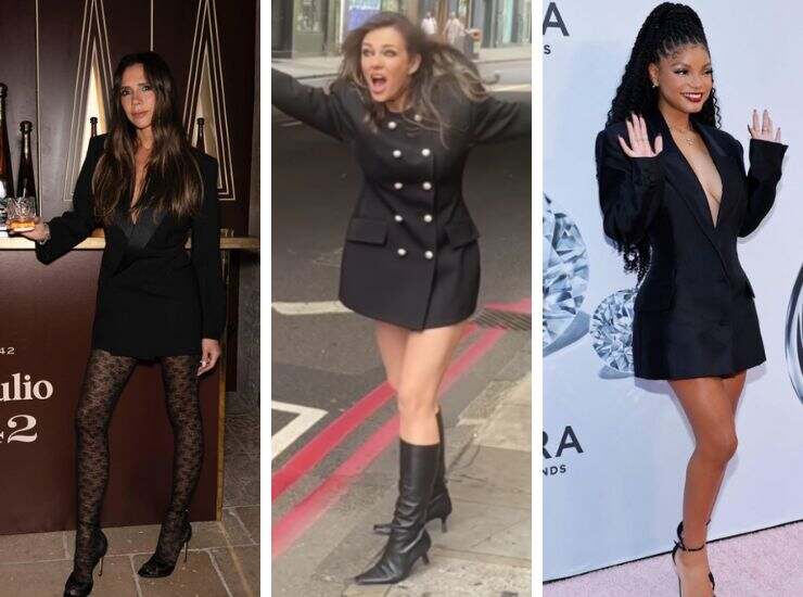 E quando la tendenza chiama, Victoria Beckham non può che rispondere a gran voce. La stilista ha indossato a sua volta una proposta di blazer dress total black, accompagnato da collant in pizzo e abbinato a sandali con tacco a spillo. Un look scelto per celebrare il lancio della sua nuova linea di fragranze. O ancora Elizabeth Hurley, che ne ha indossato una versione total black con spalline rigide e accompagnato da una doppia fila di maxi bottoni durante il suo ultimo servizio fotografico a Londra. In questo caso l’attrice ha scelto di accompagnare il look di Dolce&Gabbana con stivali ad altezza ginocchio. Anche Halle Bailey ne ha indossato uno total black, con maxi scollatura e in raso per un evento di Pandora.