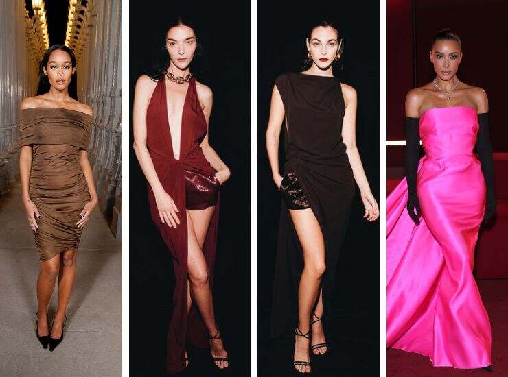 E non poteva mancare Kim Kardashian, fasciata in un abito rosa shocking in raso senza spalline, con maxi strascico e guanti neri in velluto. Il suo look è firmato Gucci. Laura Harrier inevce ha scelto un midi drappeggiato con scollo a barchetta, color bronzo, di Saint Laurent. A rappresentare Gucci anche le sue modelle come Mariacarla Boscono, fasciata in un abito borgogna, e Vittoria Ceretti che opta per una palette di marroni, colore apprezzato anche da Luisa Ranieri alla Festa del Cinema di Roma 2023.