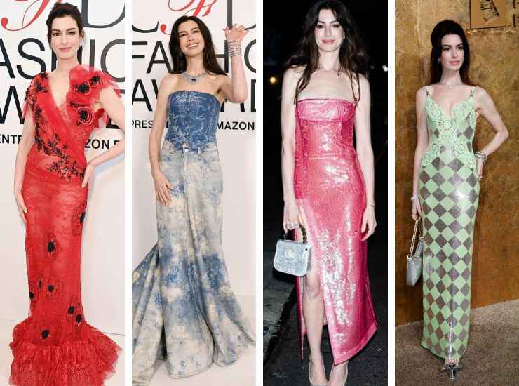 Come già detto, l’ultima volta che Anne Hathaway è apparsa sul red carpet è stato poche settimane fa, in occasione dei CFDA Awards 2023, e si concessa ben due cambi look per la serata. Il primo è in total denim, un trend ripristinato anche grazie all’intervento glam dell’attrice con il suo due pezzi floreale di Ralph Lauren. A ravvivare il blu denim è anche lo zaffiro al collo di Bulgari, di cui è ambassador. Secondo look invece porta la firma di Rodarte ed è un long dress con delicati ricami in pizzo che gioca con le trasparenze e l’aggiunta di fiori in rilievo. Un abito sensuale, di un rosso corallo, che mescola pizzo, chiffon e paillettes.