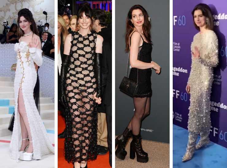 L’attrice ha raggiunto anche Berlino per il suo Festival del cinema, presentando She Came To Me. Per l’occasione ha sfoggiato un abito nude che gioca con le trasparenze, accompagnato da pois e fiocchi in pelle all over in pendant con i guanti. Il look è firmato Valentino Haute Couture. Ospite del Sundance Film Festival ad inizio 2023, Anne Hathaway ha proposto un look total black di Versace. Per la première di Armageddon Time al New York Film Festival nel 2022, ha scelto un abito sparkling di maison Valentino Haute Couture tempestato di paillettes d’argento.