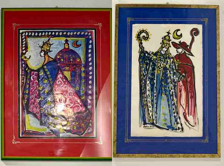 Alcuni suggestivi disegni di Massimo Bomba; a sinistra La Papessa, a destra Intrigo al Conclave, Courtesy of Massimo Bomba