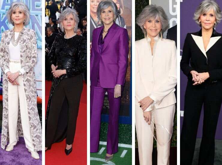 In più il 2023 ha riportato Jane Fonda anche al cinema tra le protagoniste di una nuova commedia 80 For Brady. Alla première del film, insieme alle altre co-protagoniste, ha sfoggiato un tailleur in raso sfumatura Very Peri di Pantone firmato Max Mara. A causa del Covid-19, l’attrice non è apparsa su moltissimi red carpet, per cui bisognerà tornare al 2021 per ricordare il suo trionfo ai Golden Globe, anche lato glam. In questo caso ha preferito la semplicità in un tailleur bianco panna. In realtà si tratta di un look già avvistato tempo addietro e dunque riciclato dall’attrice. Vi ha abbinato gioielli Pomellato. Quell’anno ha anche ricevuto il suo primo Humanitarian Award durante i Women in Film Gala fasciata in un tailleur in velluto di Gucci.