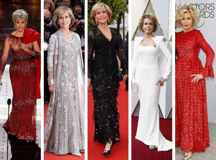 In occasione degli Oscar 2020 e i successivi Vanity Fair Oscar Party, Jane Fonda ha scelto un abito che modella la silhouette, tempestato di paillettes rosso corallo di Elie Saab Haute Couture. In avorio è il look sfoggiato nel 2019 al Festiva di Cannes, un abito mantella con ricami floreali di Valentino Haute Couture. Per la première di Le Grand Bain, sempre alla kermesse di quell’anno, ha calcato il red carpet con un look total black di Givenchy Haute Couture. Ai SAG Awards 2019, ha scelto un abito rosso ciliegia con increspature di Valentino. Infine è total white l’abito con spalline a punta di Balmain sfoggiato agli Oscar 2018. A curare i suoi look è la stylist Cristina Ehrlich.