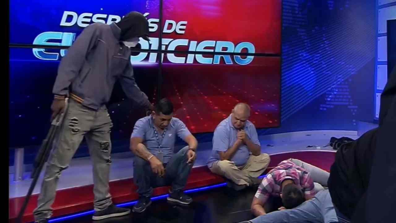 Uomini armati irrompono sulla tv dell’Ecuador il 9 gennaio 2024. Foto Ansa/Epa/Tc Noticias
