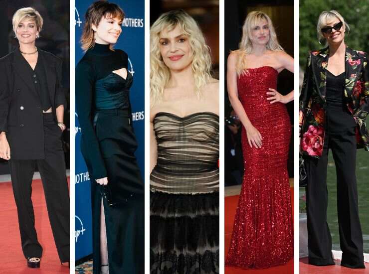 Ed è total black anche il completo indossato alla première di The Good Mothers per Disney+, firmato Dolce&Gabbana. Di ritorno alla Festa del Cinema di Roma per l’edizione 2022, ha scelto un abito nude rivestito da un velo di chiffon total black con gonna a balze, senza spalline, firmato di nuovo Dolce&Gabbana. Quell’anno l’attrice è riapparsa anche a Venezia: sul red carpet ha scelto un long dress rosso rivestito di paillettes. Il giorno seguente, ha salutato la Laguna fasciata in un tailleur total black con blazer a trama floreale.