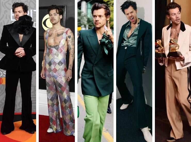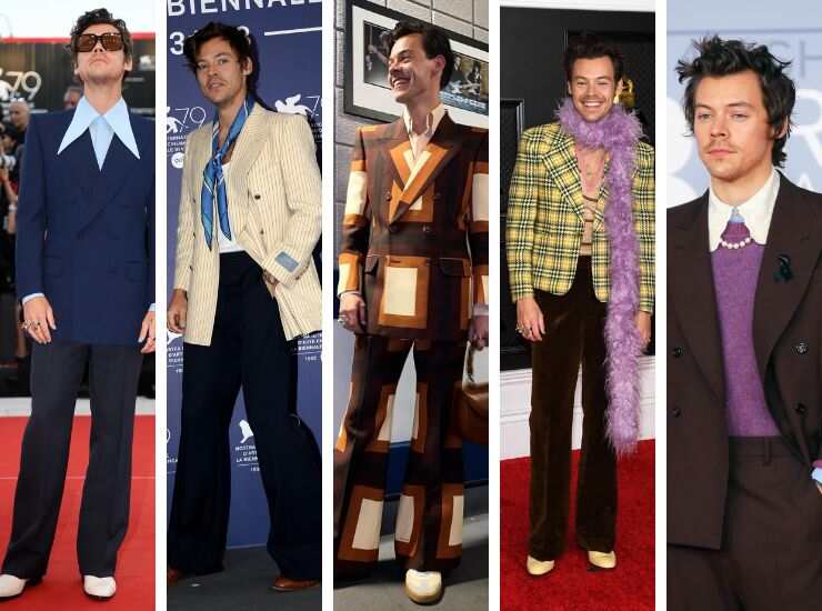 Nel 2022 Harry Styles ha raggiunto anche la Mostra del Cinema di Venezia per promuovere Don’t Worry Darling. Sul tappeto rosso in Laguna ha indossato una creazione total blue di Gucci, con colletto vintage color carta da zucchero. Il completo fa parte della sua collezione HA HA HA firmata per la maison in collaborazione con Alessandro Michele. Poco prima, al photocall, ha proposto nuovamente Gucci con un blazer gessato, foulard al collo e pantaloni in raso. Geometrica e sulla palette ramata è invece la proposta scelta per i BRIT Awards 2021: il completo colorato porta la firma di Gucci. Quell’anno, ai Grammy Awards, ha optato per un’altra creazione della maison con giacca scozzese di un brillante giallo sole e maxi boa lilla attorno al collo. Infine, ai BRIT Awards 2020, ha preferito un look classico total brown con colletto ricamato naturalmente Gucci.