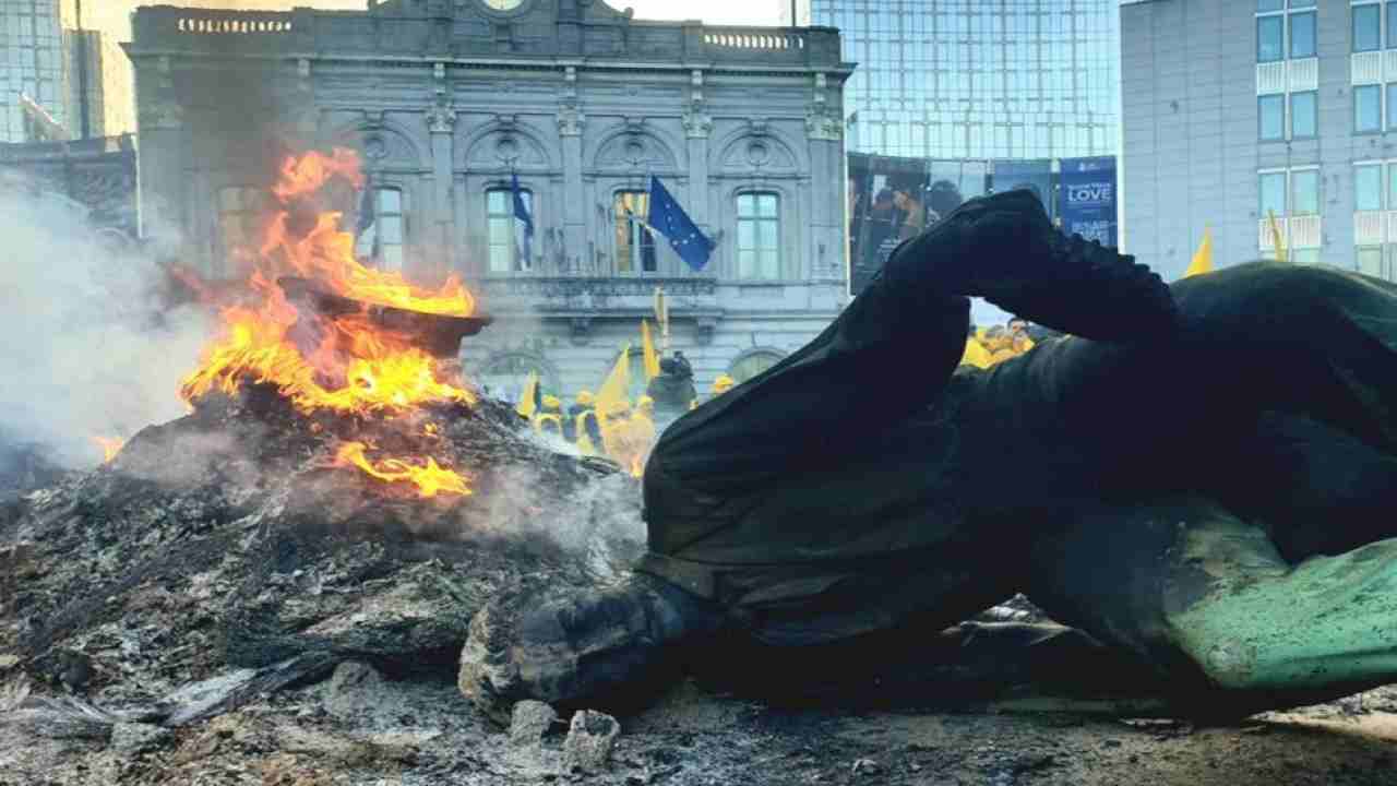 I manifestanti, presenti nelle vie adiacenti all’Eurocamera con centinaia di trattori, hanno fatto esplodere anche numerosi petardi. Arrivati da mezza Europa per protestare contro la Politica agricola comune (Pac) e il Green Deal (che bandisce le fonti di energia fossile puntando sulle rinnovabili) i manifestanti hanno poi occupato Place de Luxembourg appiccando roghi con legna e pneumatici. Non solo. La rabbia dei conducenti dei trattori si è sfogata contro una delle sculture storiche presenti a Place du Luxembourg, risalente al 1872, davanti alla sede del Parlamento europeo. La statua fa parte del complesso monumentale John Cockerill, in memoria del pioniere dell’industria siderurgica e della ferrovia in Belgio.