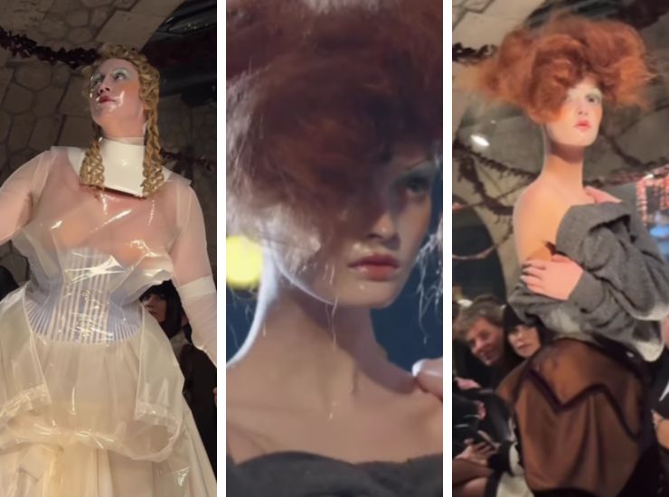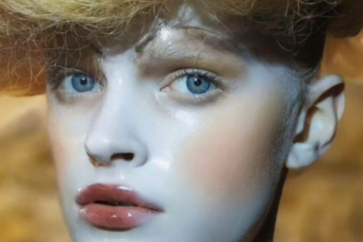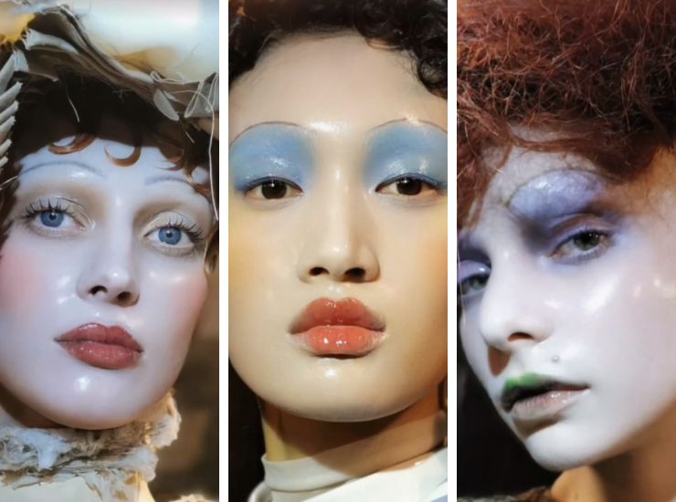 Tra trasparenze e forme geometriche voluminose tanto da creare sculture mobili, gli abiti della collezione Artisanal di Maison Margiela hanno riscosso particolare successo anche per merito dell’effetto pelle di porcellana proposto dalle modelle. Tutto merito della collaborazione tra Galliano e Pat McGrath: il risultato è un make-up luminoso, lucido, che detta tendenza per il 2024. Sfruttando il suo talento ed interpretando al meglio lo spettacolo in passerella, la make-up artist ha creato una nuova pelle su cui disegnare. Le ha trasformate in vere e proprie bambole di porcellana con una pelle lucida, gote arrossate e spesso ravvivate da sfumature pastello, con occhi spesso ravvivati da colori intensi e sopracciglia ultra sottili. L’effetto restituito è proprio quello di una bambola di porcellana.