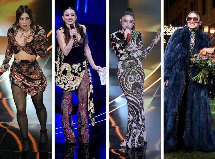 Per il terzo giorno di kermesse canora, ha optato per un altro look costum di Etro realizzato da Marco De Vincenzo, con uno style curato da Nick Cerioni. In questo caso ha optato per un minidress a base total black e pattern floreale che rincorre sfumature bronzo. Vi ha abbinato le immancabili Mary Jane e collant total black. Più colorato, d’impostazione barocca, è il jumpsuit scelto per la seconda serata. Per il suo debutto all’Ariston, invece, ha sfoggiato un long dress aderente a base nude ravvivato da un pattern floreale color cioccolato. Infine, sul green carpet prima del grande inizio, ha scelto un look geometrico accompagnato da una vaporosa mantella in eco pelliccia di Etro.