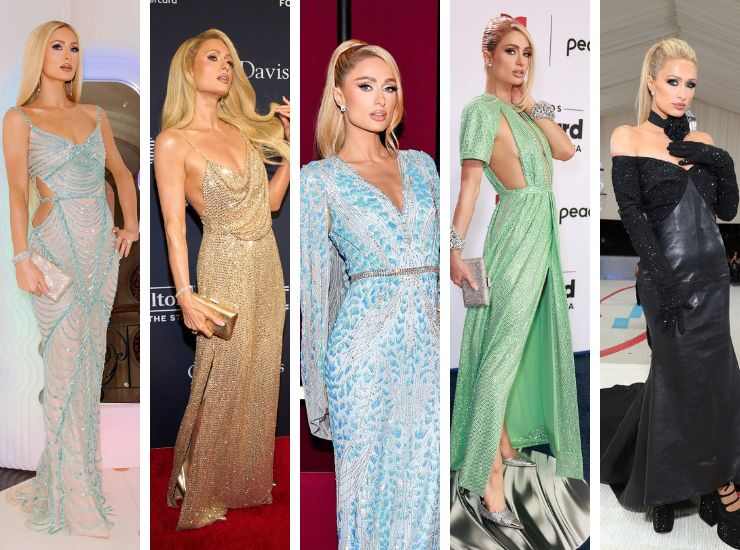 Poco prima, in occasione dei Pre-Golden Globes 2024, Paris Hilton ha incanalato appieno il mood, indossando un long dress in oro con paillettes di Celine. Azzurro ma rigorosamente con strass e paillettes e il long dress che ha sfoggiato ai LACMA 2023, firmato Jenny Packham. Invece è verde menta il long dress con dettagli cut out e scollatura verticale che ha proposto ai Latin Billboards Awards 2023. Il look con paillettes all over è firmato Area. Vi ha abbinato una pochette effetto Merdmaid di Chanel. Per il Met Gala 2023, invece, ha scelto un look di Marc Jacobs rigorosamente total black, con gonna in pelle e maxi strascico.