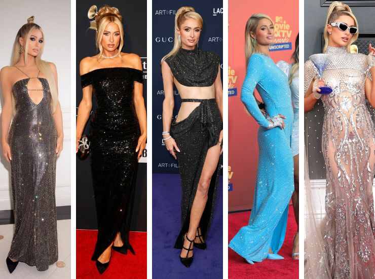 Ai Grammy 2023, ha sfoggiato un look effetto metallico di Celine, con punti luce all over. Ai Pre-Grammy invece ha optato per un long dress aderente nero con paillettes e scollo a barchetta, sempre firmato Celine. Vi ha abbinato una clutch di Jimmy Choo. Ed è total black, ma con dettagli cut out sensuali, l’abito con paillettes che Paris Hilton ha scelto per i LACMA 2022, firmato Jasmin Erbas. Ed è ancora azzurro pastello, ma tempestato di strass, l’abito scelto per gli MTV Awards 2022, firmato Solangel. Infine, ai Grammy Awards 2022, ha optato per un nude look con ricami floreali in rilievo d’argento e mantella scenografica di Peter Dundas.