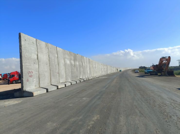 Muro in costruzione ad Al Masoura, in Egitto, a 3 chilometri dal confine con la Striscia di Gaza. Il Cairo starebbe preparando l’area per confinare in un campo profughi i palestinesi in fuga da Rafah qualora Israele attaccasse. Foto Ansa/Epa