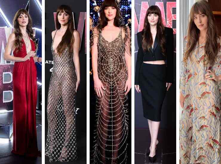 Grazie alla promozione di Madame Web, Dakota Johnson è riapparsa sul red carpet più glam che mai rendendo anche omaggio al personaggio che interpreta. In occasione della première messicana del film, ha sfoggiato un look total red con scollo a V e drappeggi di Tom Ford, a cui ha abbinato gioielli Messika. Più audace è invece il long dress aderente a trama nude e rivestito da una rama a rete che ricorda per l’appunto una ragnatela indossato alla première di Los Angeles. L’abito dalla profonda scollatura è firmato Gucci. L’attrice vi ha abbinato un collier di Messika e sandali total black della maison.