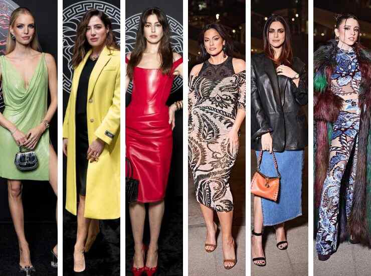 Per Simona Tabasco invece il look è sporty chic total black. Per Giorgio Armani anche Victoria de Angelis ha presenziato alla sfilata, scegliendo un look total white, un chemisier look accompagnato da pelliccia. Clara, invece, ha sfoggiato un abito azzurro pastello. Anche Versace non ha rinunciato alle sue muse. In occasione della collezione Autunno/Inverno 2024, anche Anne Hathaway ha raggiunto Milano. L’attrice hollywoodiana ha optato per una creazione rosso fuoco della maison, in pelle e con gonna dai drappeggi scultorei. Vi ha abbinato decollette ton sur ton.