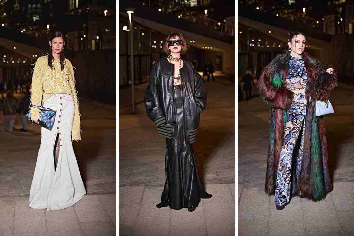 Luisa Ranieri invece ha scelto un midi total black, accompagnandolo con un trench giallo canarino che spicca. Leonie Hanne, invece, ha preferito un minidress verde menta. Infine Etro ha nuovamente contato sul supporto di Angelina Mango, fresca di vittoria dal Festival di Sanremo 2024. Al front row indossa un completo jumpsuit che gioca con le trasparenze e trama floreale tinta di blu e azzurro. Spicca soprattutto la maxi pelliccia effetto arcobaleno. Ashley Graham ha optato per un midi aderente a trama nude la cui fantasia è stata proposta da Angelina Mango a Sanremo. Infine Miriam Leone, con giacca in pelle e gonna di jeans.