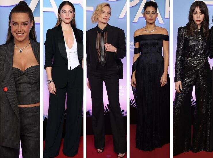 Uno dei trend riapparsi sul tappeto rosso, anche oltreoceano, e che convince sempre più anche in passerella è il completo gessato. Quello proposto da Adèle Exarchopoulos punta ad un’avvolgente tonalità di grigio. Si tratta di un completo tre pezzi con top dallo scollo a cuore firmato Coperni, avvistato in passerella per la collezione Primavera/Estate 2024 e indossato da Naomi Campbell. Vi ha abbinato sandali total black e gioielli Bulgari. Torna il black&white con Alice Isaaz, che ha scelto pantaloni palazzo e blazer total black con top total white scollato di Saint Laurent.