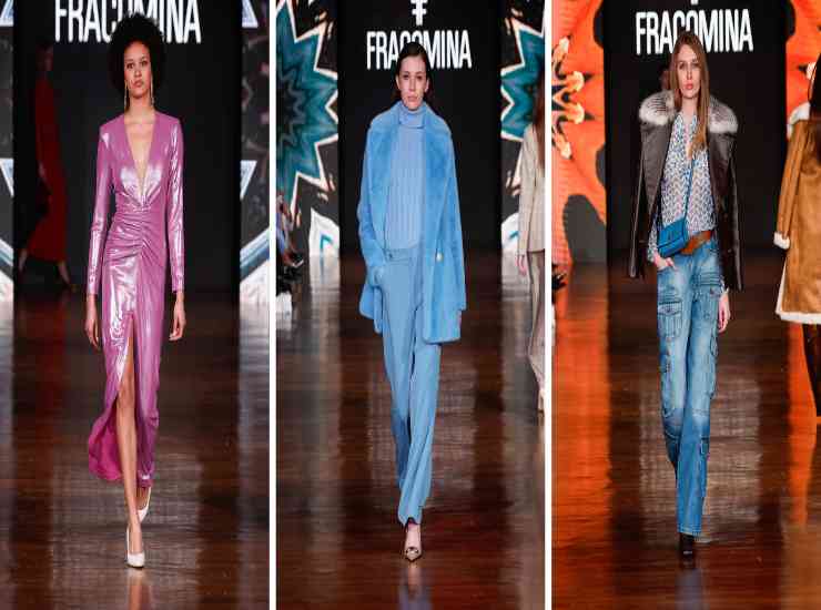 La passione per le cromie calde come il nocciola e il marrone si incanta con la pelle e con la maglieria aprendosi a nuove sperimentazioni. Il tutto si vede nei due pezzi con bermuda o nei pantaloni military da abbinare al cappotto profilato in eco fur. L’atteggiamento è branché, il look iconico e amplifica la femminilità: positiva e chic, forte e seduttiva. Il corpo è scoperto, desiderabile e ipersensuale grazie ai lunghi abiti, che sono laminati, in paillettes, in voile e in tulle, e alle jumpsuit fascinose. E ancora la combinazione giacca e pantalone è splendida splendente. La palette è una gimcana tra celeste, viola e rosso, brillante e indimenticabile come la donna Fracomina.