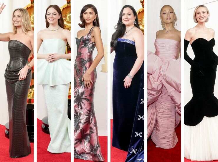 Anche Zendaya è apparsa sul red carpet degli Academy Awards, optando per un look floreale che rincorre il rosa antico in raso e un bustier total black con scollo a cuore tempestato di paillettes. Il suo look porta la firma di Armani Privé. Vi ha aggiunto gioielli di Bulgari. Lily Gladstone ha sfoggiato un long dress in velluto di Gucci con strascico a trama floreale di un intenso blu cobalto. Ariana Grande ha scelto un abito rosa pastello interamente drappeggiato, con mantella in raso ton sur ton di Giambattista Valli Haute Couture. Vi ha aggiunto gioielli di Tiffany&Co. Per Carey Mulligan invece il look è da diva: total black in velluto, con scollo a cuore e guanti in pendant, e gonna in chiffon bianco perla. Si tratta di un look costum di Balenciaga.