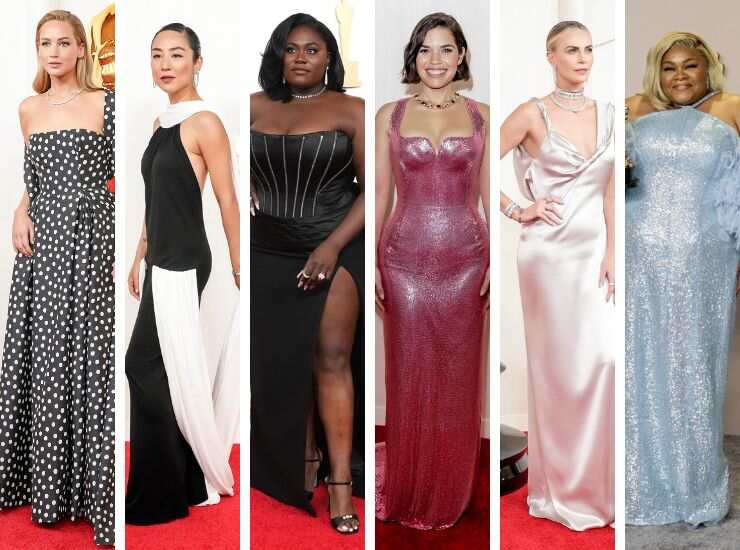 Da Old Diva è invece il look proposto da Jennifer Lawrence: ha riportato i pois sul red carpet con un look costum di Christian Dior Haute Couture. Vi ha abbinato un collier di Swarovski. Black&white è anche il look proposto da Greta Lee, firmato Loewe. Per Danielle Brooks il look è total black di Dolce&Gabbana con corpetto tempestato di strass. Vi ha abbinato gioielli di De Beers. A differenza della collega, America Ferrera ha portato Barbie con sé agli Oscar con un long dress costum di Atelier Versace total pink. Spicca il collier di Pomellato. Raffinato è il long dress in raso, sfumatura avorio, scelto da Charlize Theron e firmato Christian Dior Haute Couture. Per Da’Vine Joy Randolph l’abito è una creazione di paillettes e rouches azzurro pastello di Louis Vuitton.