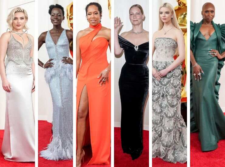 Regina King osa con un abito corallo, con dettaglio monospalla, in raso, e cascata di strass ton sur ton che ravvivano il busto. Si tratta di una creazione costum di Atelier Versace con gioielli Pomellato. Per Sandra Huller il look da red carpet è total black, in velluto e con scollatura scenografica appuntita di Schiaparelli. Vi ha abbinato gioielli Cartier. Anya Taylor-Joy non tradisce Dior e propone un long dress d’argento con gonna a micro balze con paillettes. Invece Cynthia Erivo incanala il suo personaggio di Wicked e indossa un look in pelle bottiglia petrolio di Louis Vuitton.