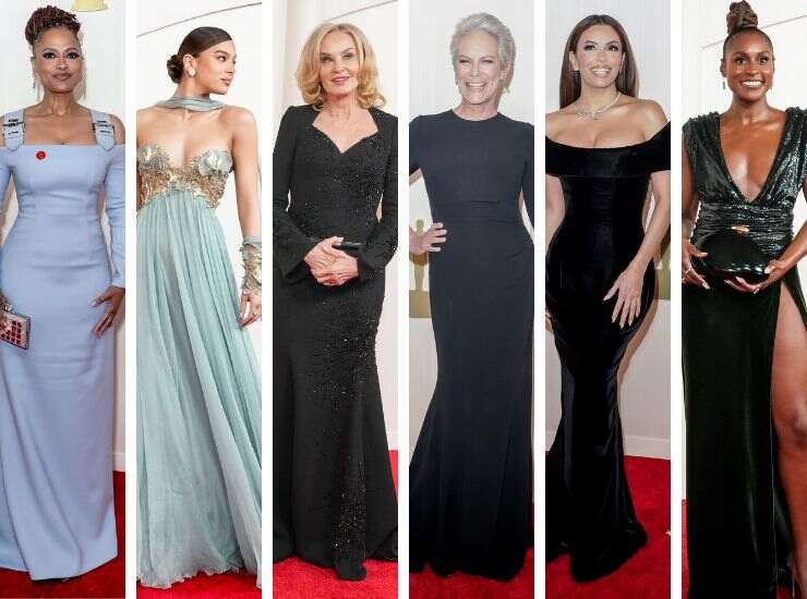 Color carta da zucchero è il long dress scelto da Ava DuVernay, con maxi spalline e firmato Louis Vuitton. Vi ha abbinato gioielli di Reza. Verde acqua invece è l’abito in chiffon con corpetto gioiello intarsiato d’oro dalla scollatura geometrica scelto da Hailee Steinfeld. Il look munito di mantella ton sur ton e polsini in pendant porta la firma di Elie Saab Couture. Riappare anche Jessica Lange sul red carpet degli Oscar 2024, fasciata in un long dress total black tempestato di paillettes.